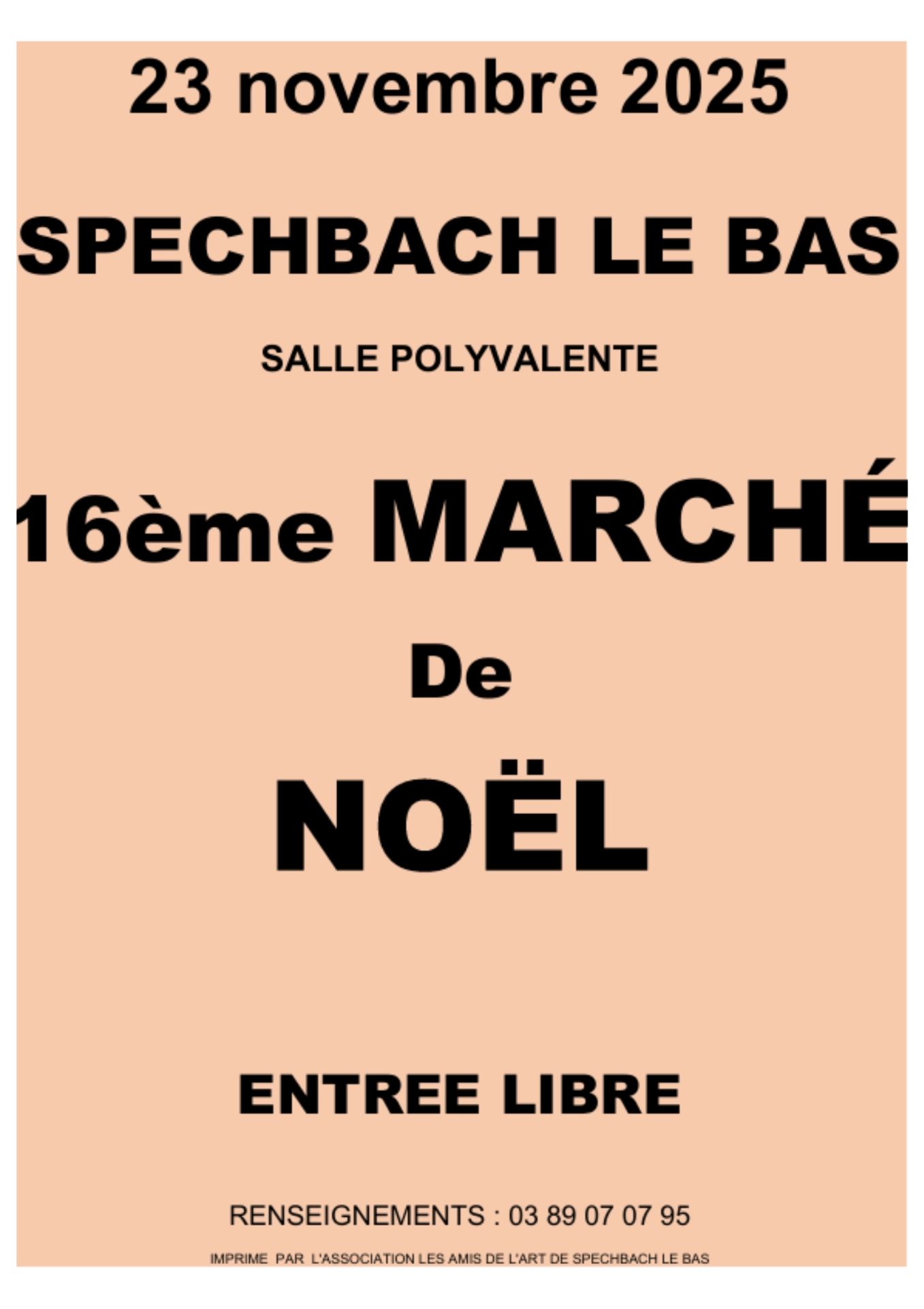 Nous serons présents au 16ème Marché de Noël de Spechbach-le-Bas ! Le 23 novembre 2025 Salle Polyvalente – Spechbach-le-Bas Nous avons le plaisir de vous annoncer que notre association participera à cet événement festif ! Venez découvrir notre stand, échanger avec nous et profiter de l'ambiance chaleureuse du marché de Noël L'entrée est libre, alors n'hésitez pas à venir nombreux !