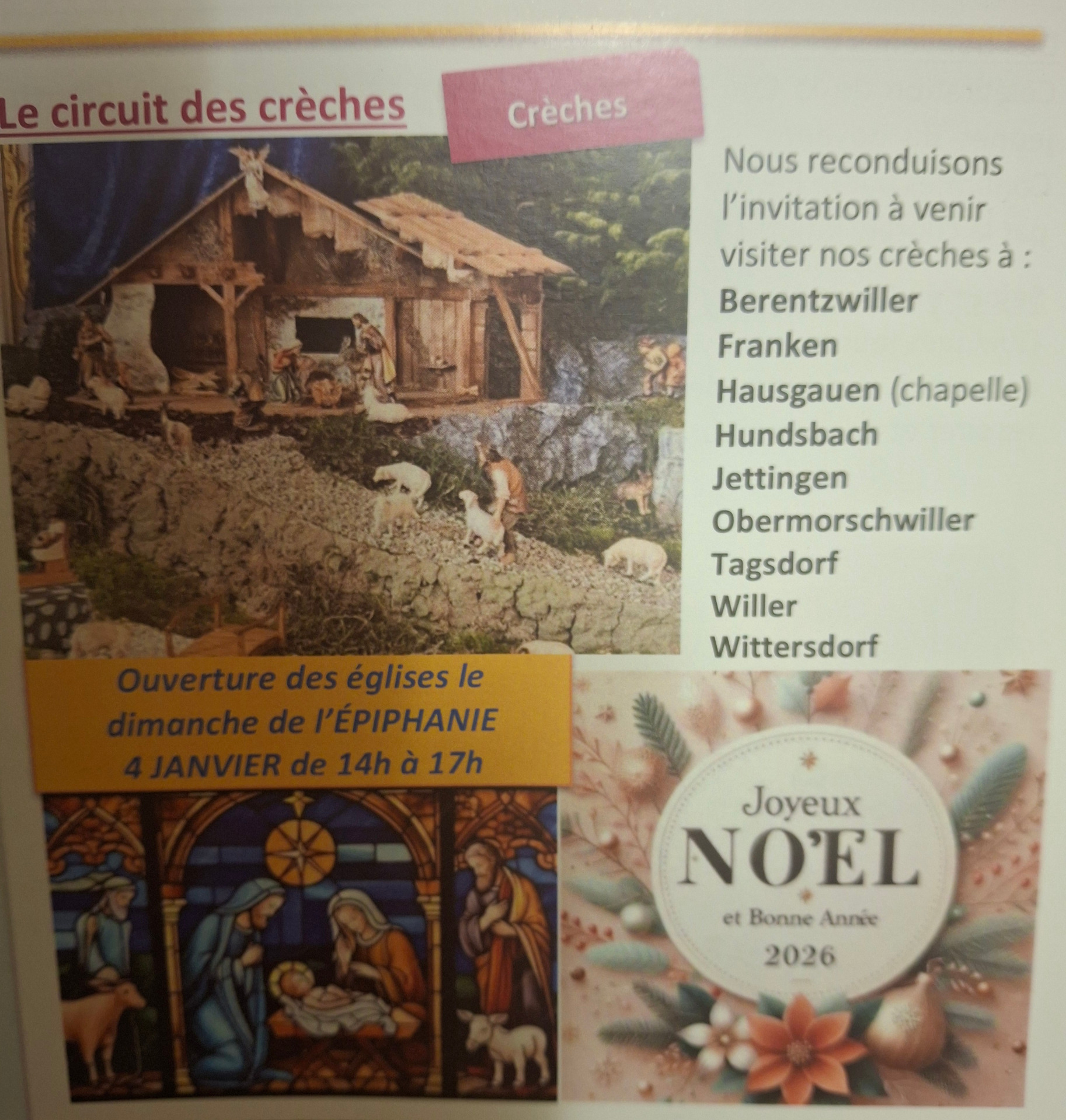 un circuit des crèches est organisé dans les églises de la vallée de Hundsbach ainsi que dans la chapelle st brice de Hausgauen le dimanche 4 janvier.