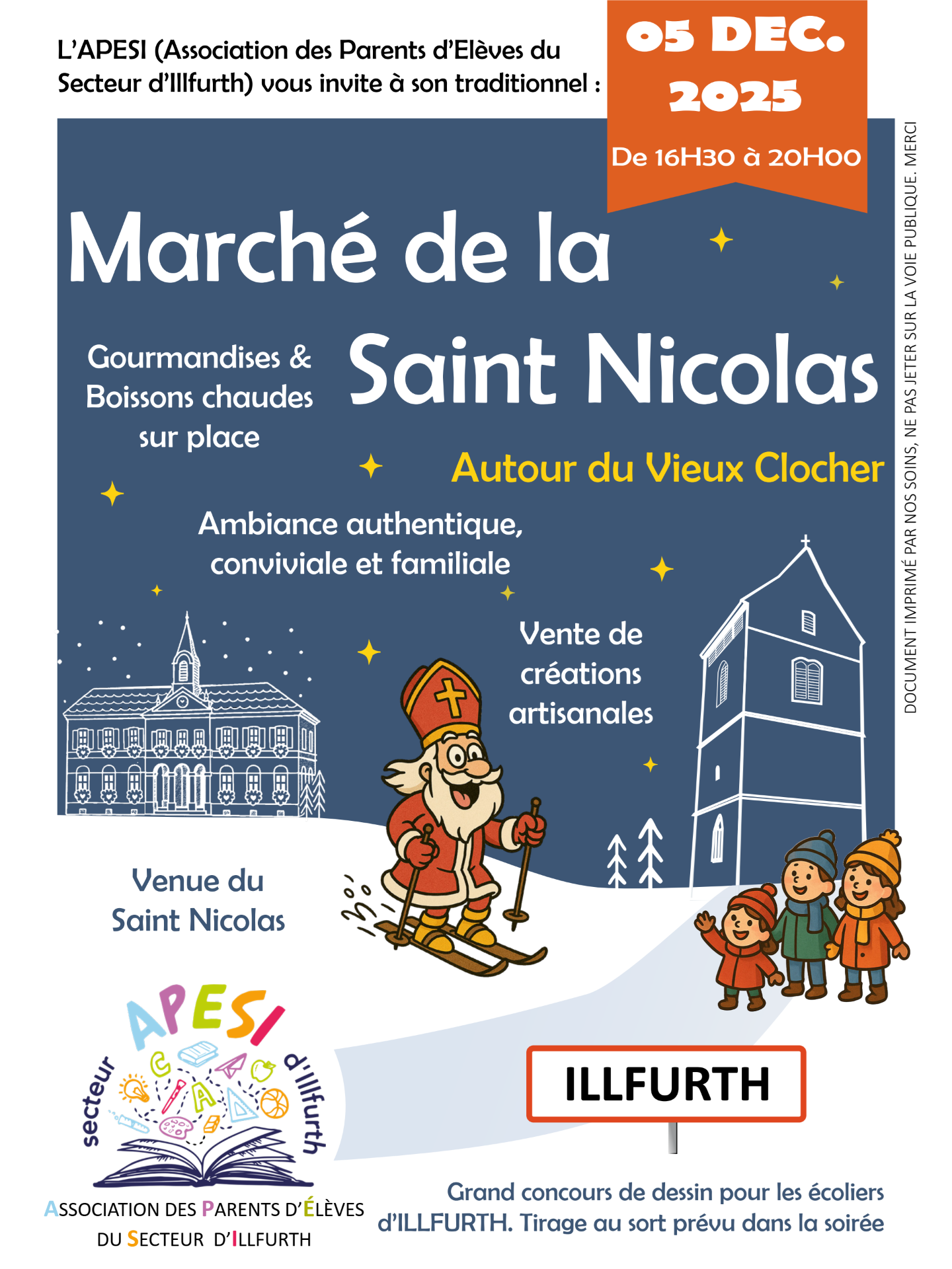 Dans le cadre de l'organisation du Marché de la Saint-Nicolas organisé par notre association de parents d'élèves du Secteur d'Illfurth (APESI), qui se tiendra le vendredi 5 décembre 2025 à partir de 16h30 autour du Vieux Clocher d'Illfurth, je me permets de vous contacter afin de solliciter votre aide pour la promotion de l'événement. Nous serions très reconnaissants si vous pouviez relayer notre affiche et diffuser quelques mots à propos du marché sur vos réseaux.